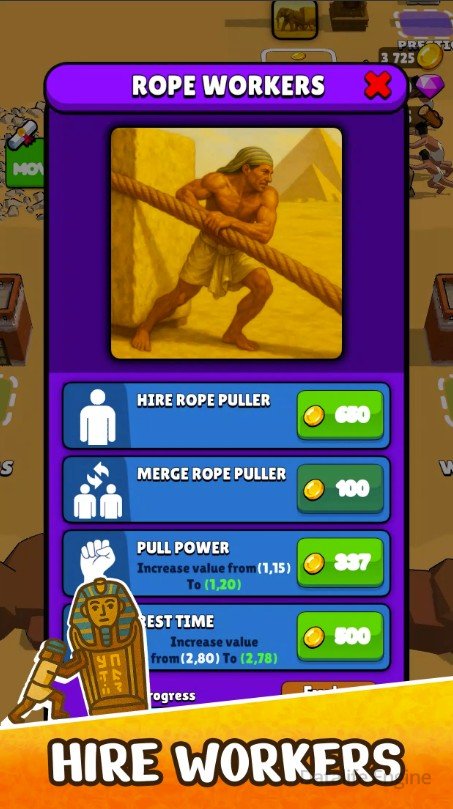 Что можно улучшить, чтобы доставлять тяжелые объекты? Уменьшайте время отдыха, делайте рабочих сильнее, пополняйте численность бригады и т.д. В Tomb Pusher люди – не единственная сила, к которой можно прибегнуть. Изучение технологий откроет доступ к верблюдам и слонам, а мощи этим животным не занимать. Мод на много денег обеспечит вас дополнительной игровой валютой, чтобы вы быстрее приступили к выполнению самых сложных задач.Этапы